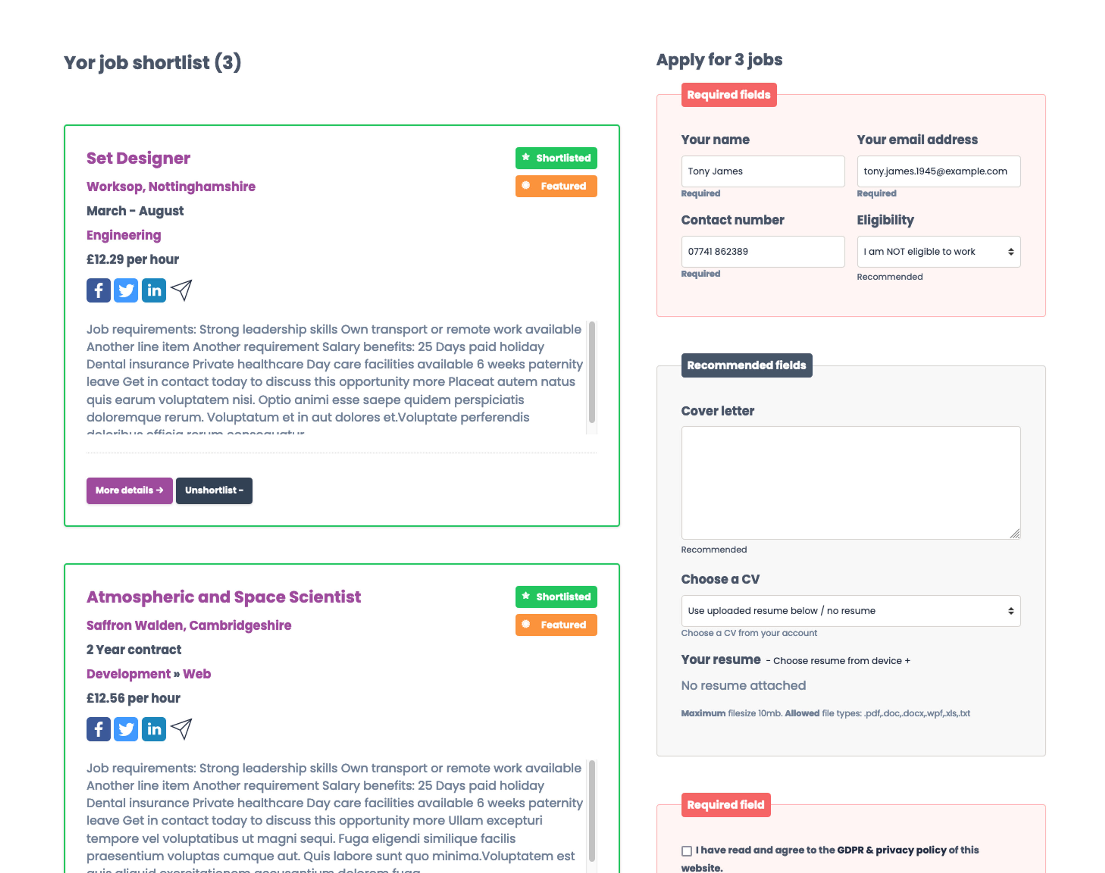 Once your shortlist has loaded you can apply for the jobs all at once by filling in the required fields on the application form, attaching any CV's or resumes you have on the page and press the Submit Application button